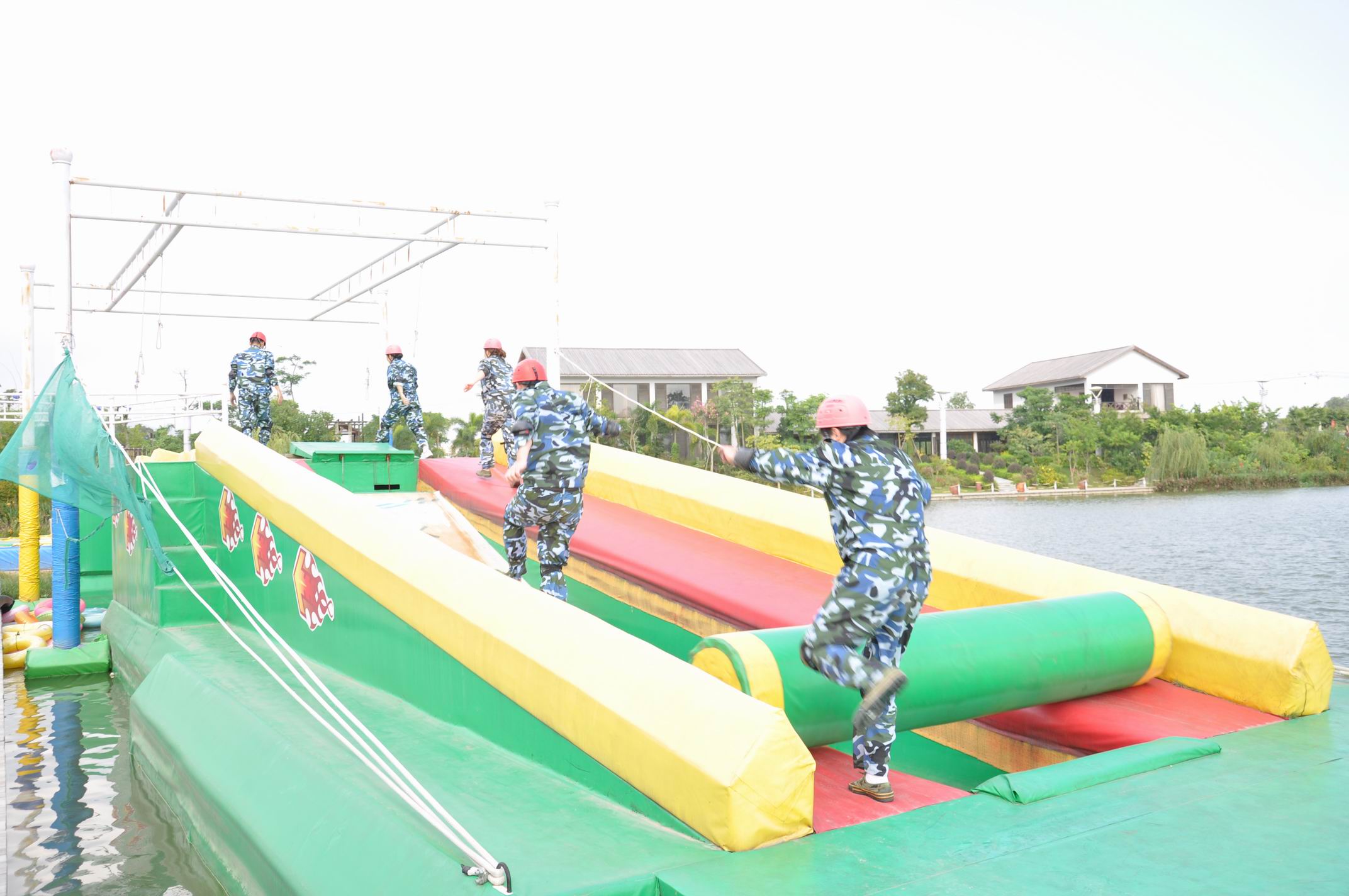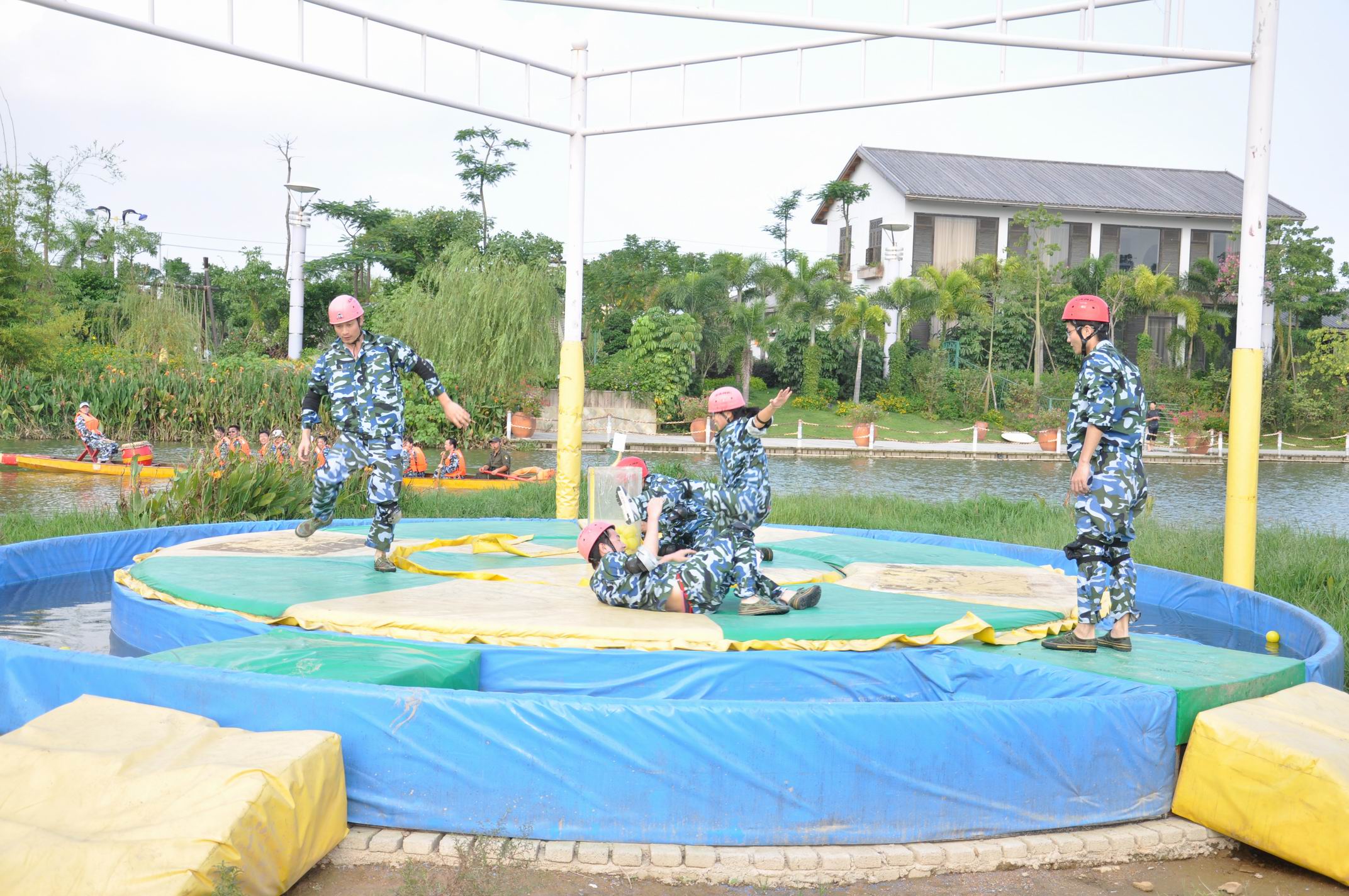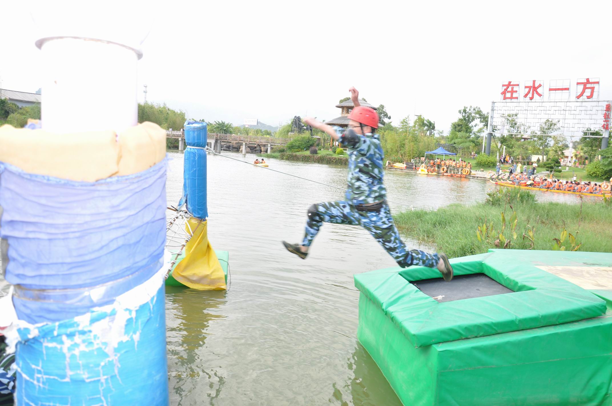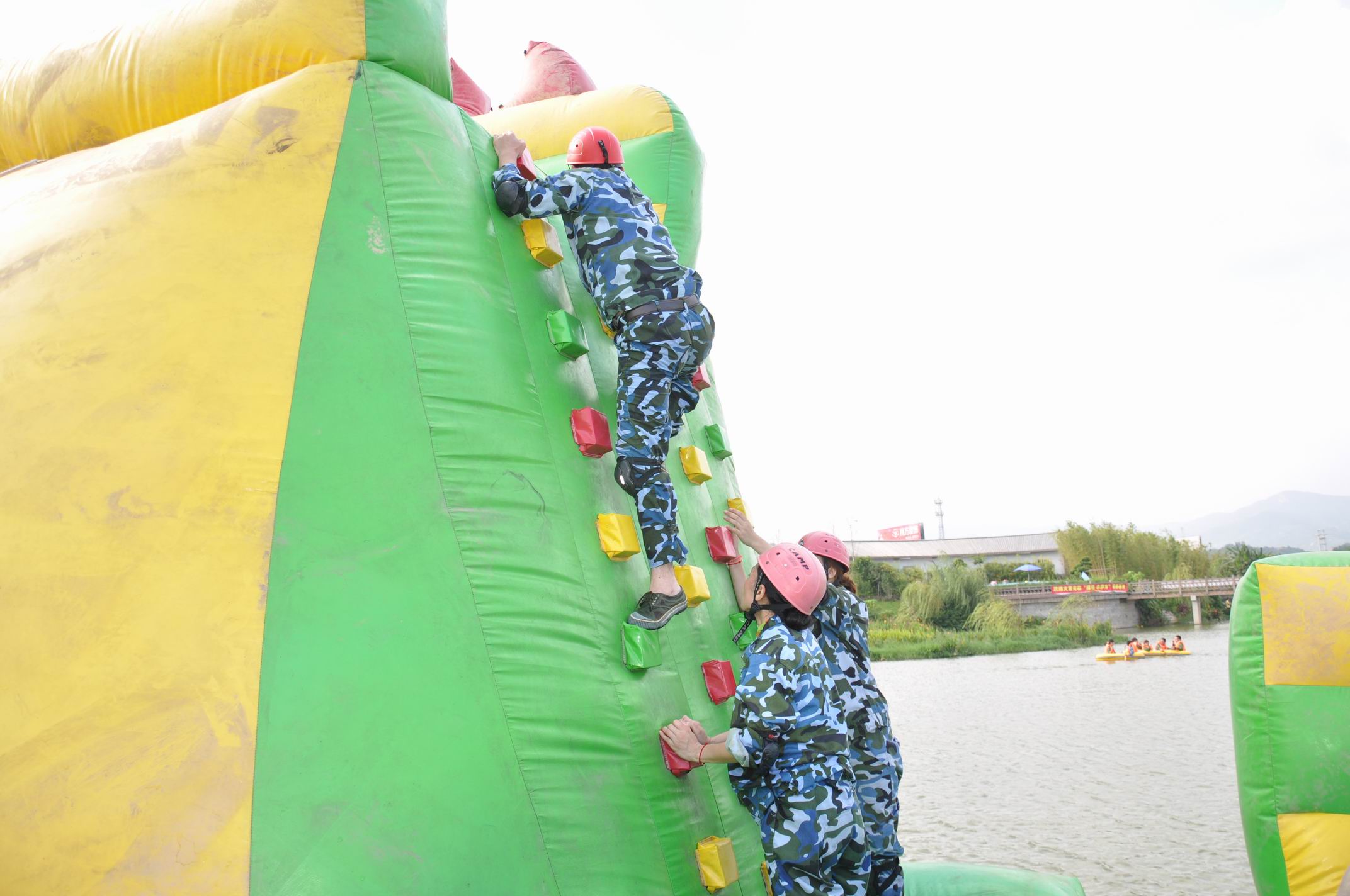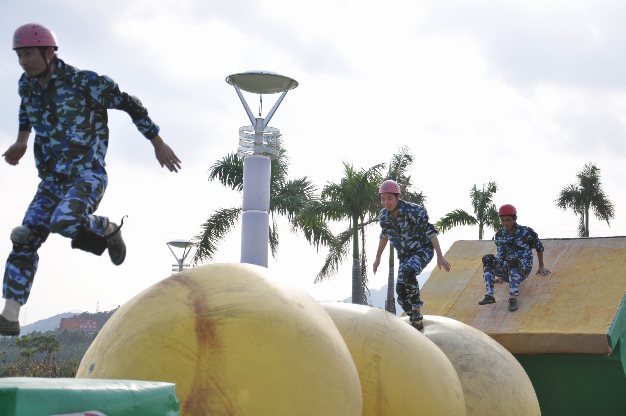 我們第四小組是第四組出場。這就有機會多看看前面幾組的闖關(guān)經(jīng)驗,汲取下經(jīng)驗。第一組在最后第三關(guān)卡時候全軍覆沒,全體“濕身”。悲催??!引起很多人的嘆息和反思。炮灰就是悲劇啊!炮灰的人你們傷不起!接著,第二組出戰(zhàn)!由于該組女子占99.99%,所以出戰(zhàn)陣型就全裝——全部女子。誰說女子不如男,四個女子表現(xiàn)很鎮(zhèn)定,也很勇敢,最終在一陣精彩喝彩中完美完成挑戰(zhàn),無人“濕身”,起了個好兆頭。第三組,正常隊形,一人在第一關(guān)卡落難“濕身”,一人在轉(zhuǎn)盤落難“濕身”,其余通過!最后一組輪到我們了。不得不說,看前幾組闖關(guān)的時候,我心臟也沒這么鼓蕩,撲通撲通地亂跳。深呼吸,深呼吸,走!去“濕身”吧。我們組三男二女開始了挑戰(zhàn)巨龍島。不幸的是我們?nèi)齻€男子中小蘇叫我第一個上。好吧,早跳早“濕身”。第一關(guān)卡:必須蛙跳到彈性球上,而且是連續(xù)兩個,中間一個彈性板。慢慢來,我強壓心慌,在一片驚呼聲中險險地安全著陸,再一聲疾呼聲中安全著陸,很幸運,我們?nèi)凶尤客ㄟ^第一關(guān)卡。然后是和二女接應(yīng)合作過獨木橋,爬轉(zhuǎn)盤,扔彈球,越絲網(wǎng),跳小艇,滑扶梯,上山巖,各中險象環(huán)生,一波三折,跌宕起伏,驚呼聲一浪接著一浪,最終也是完美地全部通過無人“罹難”,位居本批比賽的準(zhǔn)榜首!通過這項勇闖巨龍島比賽關(guān)卡,我們這組壯士們個個灰頭土臉的,但是很欣慰。在闖關(guān)過程中的那種配合默契,彼此互扶最終迎接勝利的體驗還是很棒的!
