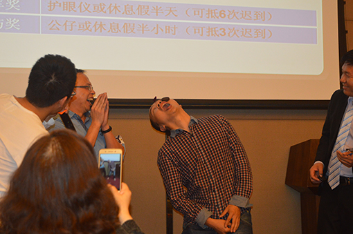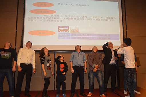 脖子最酸獎:圖為員工們參加“擠眉弄眼”游戲中努力讓臉上的餅干不掉下來